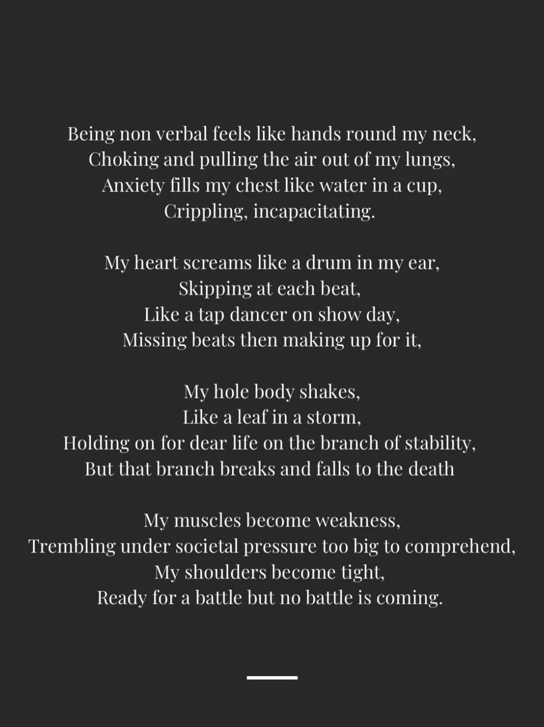 As trust grew, we felt more confident to use more experimental creative approaches, and decided to dedicate one session to anger as a transformative emotion. This task grew from conversations about autism: the pressure to mask; the energy that takes; the need to be heard but not being allowed to have a voice and the frustration this creates. The resulting work shared unique experiences of autism; challenged myths and assumptions and showed vulnerability and power. For many, this confidence has extended beyond the project, with participants continuing to share their creative voices publicly and agreeing to continue to meet. As the participants began the group as strangers, their commitment to form a community was a beautiful sign of how far they’d come.